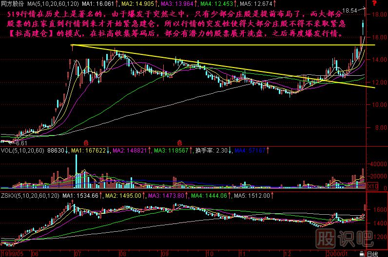 小結(jié):有時(shí)候由于行情的突發(fā)性,或者莊家來晚了,只能選擇有潛質(zhì)的股票來個(gè)緊急拉高建倉,否則行情不等人,已經(jīng)沒有時(shí)間給他磨嘰了。也可能是莊家拆借資金的渠道所限,該筆資金只能使用一定的時(shí)間,不得以必須緊急拉高建倉,這就是拉高建倉產(chǎn)生的市場(chǎng)背景。這樣的建倉模式是以空間換時(shí)間的方式,在短期內(nèi)大幅拉高,造成散戶的心理恐懼,之后一展開洗盤,很容易就把散戶的籌碼洗到莊家口袋里了,一般洗盤到芝麻點(diǎn)就結(jié)束洗盤,之后突破前頭部爆發(fā)行情!