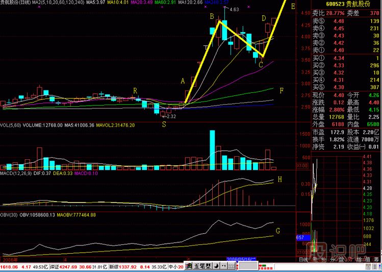 一般說,很少有人敢于跟風(fēng)買入的,到達(dá)B點(diǎn)幾乎已是六成漲幅,愿意賣出的人早已賣出了,不愿賣出的人是賣跌不賣漲的,越漲越不賣。于是,莊家再往下殺跌,此時(shí)獲利盤蜂擁而出,莊家只需低位買入即可。股價(jià)跌到C點(diǎn),成交量萎縮到“量芝麻點(diǎn)”,好像要賣的人也不多了,“拉高建倉”基本完成任務(wù)。顯然,不拉高就完不成建倉任務(wù),快速建倉是以提高收購成本為代價(jià)的,但如果不這樣拉高、殺跌地折騰,收購成本可能更高,收購時(shí)間可能拖得更長(zhǎng)。今天,該股已漲到D點(diǎn),離前B點(diǎn)的最高收盤價(jià)一步之遙。B點(diǎn)以下是莊家成本區(qū),莊家不會(huì)讓股價(jià)長(zhǎng)時(shí)間滯留在這里,讓散戶享受成本價(jià)。因此,沖過前頭部的速度可能很快,現(xiàn)在是很好的買入時(shí)機(jī)。一旦突破B高點(diǎn)后,該股的上升空間就是莊家成本的N倍,就算是兩倍,4.50的兩倍就是9元。