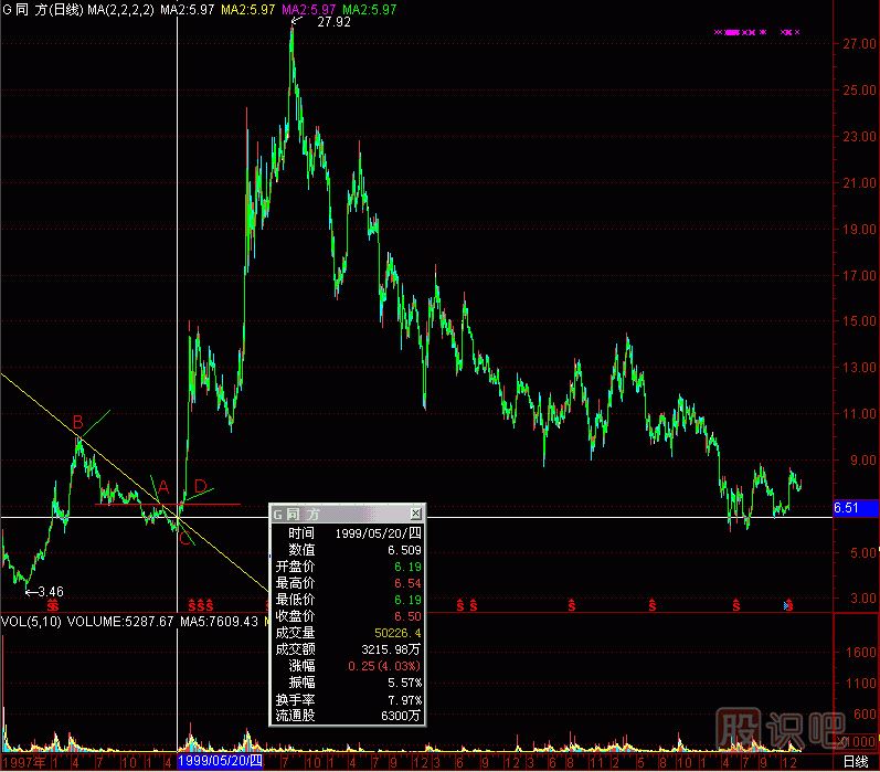 清華同方的股價從B點的10.11元,經(jīng)過11個月的下跌,到達C點的5.92元,成交量極度萎縮。顯然,整個B、C和最低點3.46元的大三角形,是莊家收集籌碼的“底坨”,既然是“底坨”,等待洗盤完畢后,就必然會展開主升浪。從A點作“水平攔截線”,就取得D點的買入點,用前高點B和A點作“斜下攔截線”,就取得C點的買入點。這樣,筷子線就形成了。而那天收盤后做電視節(jié)目時,股價已觸及B、A“斜下攔截線”。因此判斷,股價有向上突破“筷子線”展開主升浪的可能。