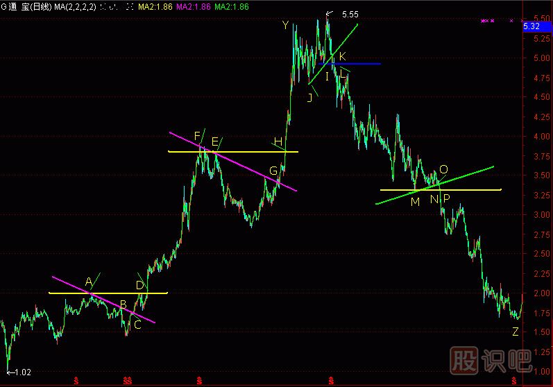 (圖286-6)是 600780G通寶的日K線圖,從中可以清晰地看到四雙“筷子線”。A高點是“底坨”上方的“筷子線”,得到C、D兩個攔截點,在這里買入,得到D、F之間的巨大利潤。而在A點“筷子線”以下,大部分是盤整行情,很難盈利。所以有句話:“只做坨突破,不做坨盤整”。“上升中繼坨”的高點E處有兩條“筷子線”,得到G、H攔截點,這又是一次買入的好機會,從而得到H、Y間的巨大利潤。