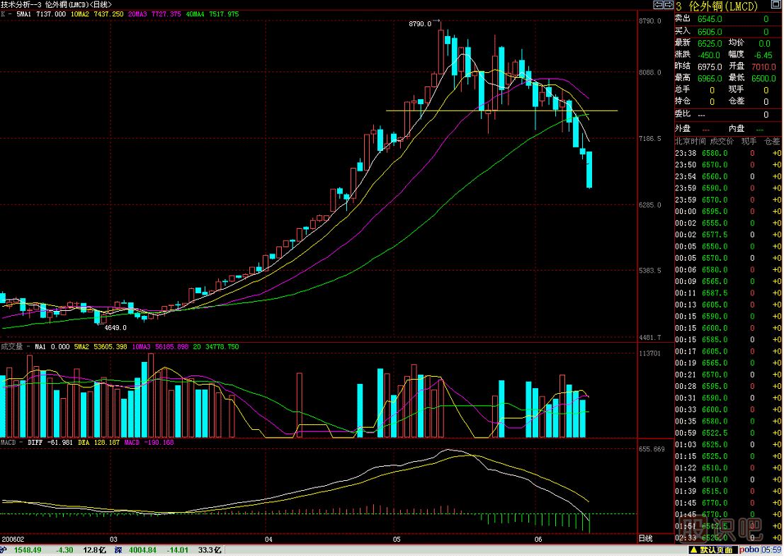 2006年6月13日編輯本文時,期貨倫外銅LMCD日K線圖已跌得面目全非(圖268-2),滬深兩市的“有色金屬”股也有巨大跌幅,慘重損失,初跌形態(tài)就是一門“空方炮”!