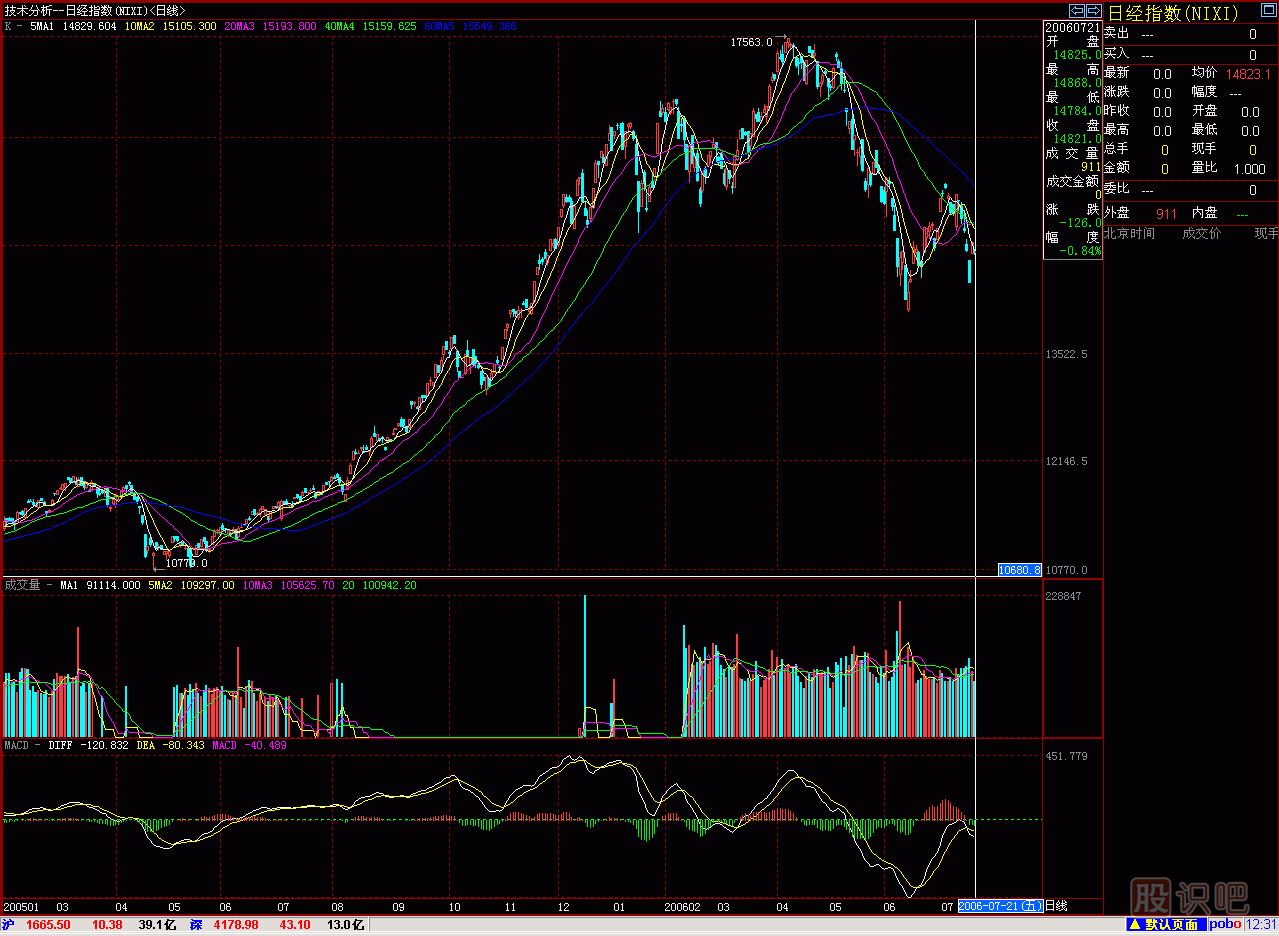 (圖266-3)2006年7月21日檢查預測效果時,日經指數(shù)(NIXI)的日K線圖。其中“大刀砍”和“斷頭鍘刀”的形態(tài)非常標準,實際走勢與(圖266-2)中的H-I-J預測基本吻合,現(xiàn)在已走K,估計未來還會沿著L-M-N的預測運行。
