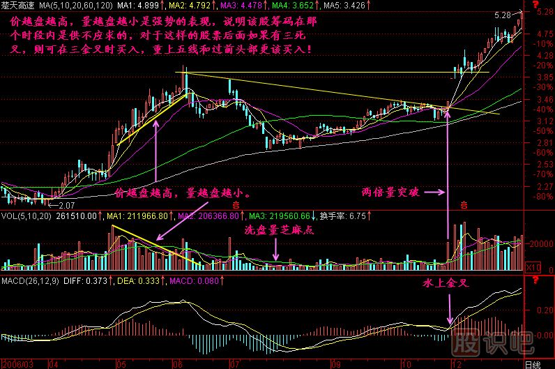小結(jié):價越盤越高,量越盤越小是強(qiáng)勢的表現(xiàn),表明該股的籌碼處于供不應(yīng)求狀態(tài),表明莊家對該股看好的程度,當(dāng)然這其中也會混入大量的散戶,所以這樣的走勢后面不排除有借指數(shù)回檔洗盤的可能,不管是否洗盤,我們都有辦法對付它,如果三死叉洗盤的話,我們就等待三金叉買入,或者重上五線買入、過前頭買入,總之這樣的股票如果在低位被發(fā)現(xiàn),是不能放過的!