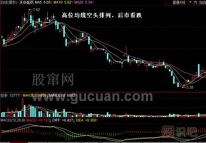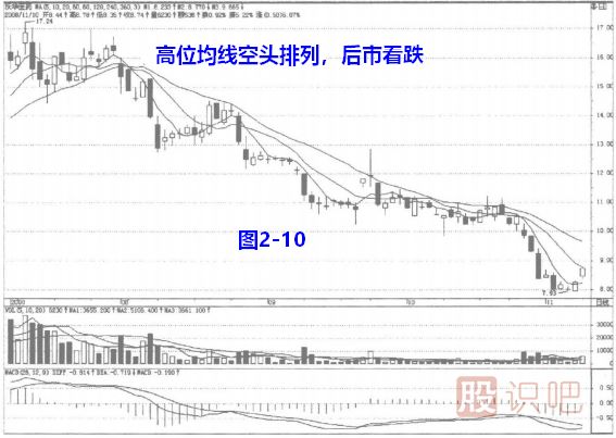 空頭排列指的是日線在下,以上依次分別為短期線、中期線、長期線,這說明我們過去買進(jìn)的成本都比現(xiàn)在高,做短、中、長線的此時(shí)拋出都在“割肉”,市場(chǎng)一片看壞。顯然,這是典型的熊市。