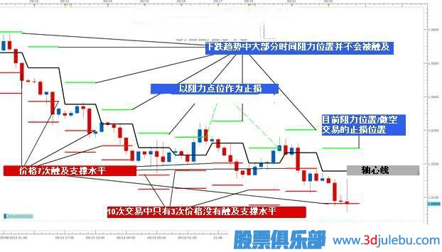 軸心交易法 在運(yùn)用軸心點(diǎn)系統(tǒng)時(shí),你可以通過觀察軸心點(diǎn)線(上圖中為黑色)是上行或者下行以確定當(dāng)前市場(chǎng)的整體趨勢(shì)。當(dāng)市場(chǎng)有了明顯的趨勢(shì),交易者可以根據(jù)具體趨勢(shì)依照軸心點(diǎn)系統(tǒng)設(shè)置止損止盈。比如下跌趨勢(shì)中,將支撐設(shè)為止盈而將阻力位置設(shè)為止損。