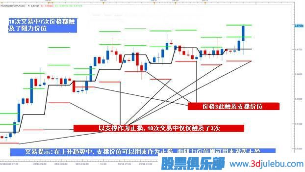 阻力位置似乎對(duì)於價(jià)格有著明顯的牽引作用。我們可以運(yùn)用支撐作為止損,利用阻力作為盈利目標(biāo),而且如果你并不急於平倉,想繼續(xù)順勢(shì)持倉,那么你也可以隨著指標(biāo)逐漸上移你的止損。上圖中美元/瑞郎的交易也表現(xiàn)了該交易系統(tǒng)的高勝率,10次交易中僅有3次因?yàn)橛|及止損而失敗。看完文章,我想大伙兒應(yīng)該明白短線交易技巧之軸心交易法(圖解)了吧!中短線炒股技巧早已在上述文章為大伙兒開展了幾番解讀,堅(jiān)信諸位在看了以后應(yīng)該可以了解要留意的某些關(guān)鍵事宜哦。