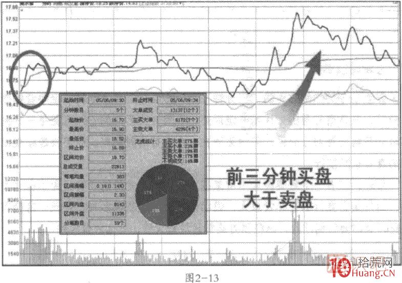 第三種開盤形態(tài)是平開,即開盤價(jià)與昨天的收盤價(jià)一樣。平開開盤沒有方向性提示,關(guān)鍵看頭一筆大單交易的方向:第一筆大單是買盤,并且連續(xù)在3分鐘內(nèi)買盤大于賣盤,全天方向向上;反之,則向下。我們先看圖2-13