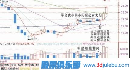 對于一般穩(wěn)健投資者來說,或者是不喜歡追漲,選擇此類小陰小陽蓄勢待發(fā)的圖形,當發(fā)現(xiàn)時逢低買進持股不到一周必會大陽突破,享受上升浪賺錢的樂趣。