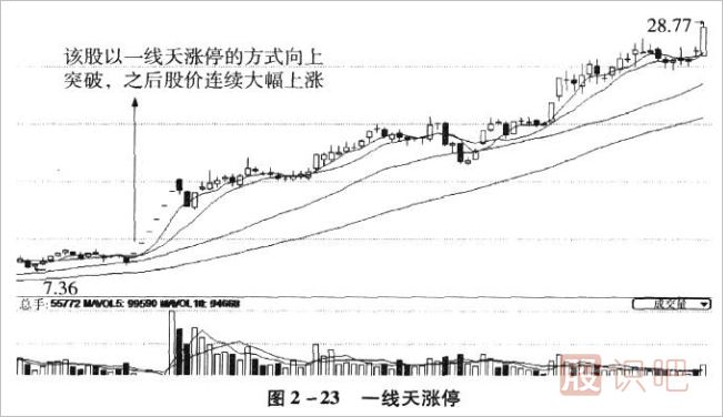 如果一線天為漲停,且出現(xiàn)在上漲初期,那么后市繼續(xù)漲停的概率很大,激進(jìn)的投資者可以在當(dāng)天掛漲停的價位進(jìn)行買入,一旦盤中成交,則可能后市繼續(xù)收獲漲停,如圖2-23所示。但是不能買入過多,以避免漲停打開后形成陰線。