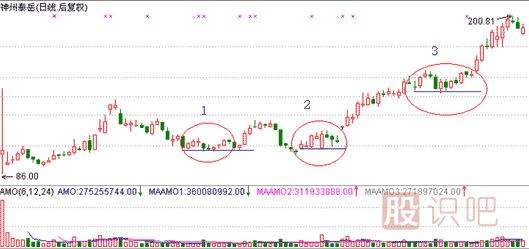 神州泰岳(300002)在上市后出現(xiàn)了三次平底結(jié)構(gòu),圖中1和2構(gòu)造了股價(jià)啟動(dòng)前的雙底結(jié)構(gòu),3是波段性底部。從該股走勢(shì)看,該股多采用平底橫盤整理,這正是超級(jí)強(qiáng)勢(shì)股的特征,大家仔細(xì)觀察一下,這三處K線成交量都是萎縮的,而且后面都跟著一根大陽線,特別是2處后面跟的是一根接近一字板的漲停K線,這些都符合實(shí)戰(zhàn)要點(diǎn)。
