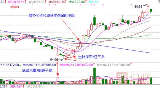 機(jī)器人(300024)2010年2月,這是一個(gè)經(jīng)典的底部,先是倒錘子線和底部大量組合,隨后出現(xiàn)了金針探底完成了底部確認(rèn),最后是一個(gè)紅三兵多方炮,最終股價(jià)完成了漂亮的V形反轉(zhuǎn)。底部出現(xiàn)紅三兵后股價(jià)在11個(gè)交易日漲幅67%,紅三兵威力可見(jiàn)一斑。此處需要我們注意的是,該股這個(gè)底部是個(gè)多個(gè)底部形態(tài)的復(fù)合體,這也為實(shí)戰(zhàn)參與提高了成功概率,而且這個(gè)股票均線和趨勢(shì)最佳買點(diǎn)同時(shí)出現(xiàn),實(shí)盤中確實(shí)給了大家很多機(jī)會(huì)。