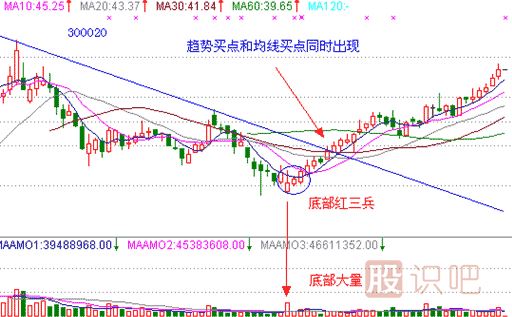 300020,銀江股份。2010年2月初,股票出現(xiàn)了紅三兵組合,而且和底部的大量同時(shí)出現(xiàn),在***中出現(xiàn)了紅三兵大家可以適當(dāng)跟進(jìn),一旦股價(jià)翻越趨勢(shì)線和均線密集纏繞則可以重倉(cāng)買入,而且此股的趨勢(shì)最佳買點(diǎn)和均線最佳買點(diǎn)同時(shí)出現(xiàn),臨盤掃貨絕不手軟。