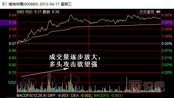 博瑞傳播(600880),該股在2013年4月16日、17日和18日出現(xiàn)紅三兵底部反轉(zhuǎn)形態(tài),同時(shí)股價(jià)越過(guò)短期下降趨勢(shì)線,成交量相對(duì)放大,實(shí)盤時(shí)可考慮試探性參與。大家需注意,這個(gè)地方陽(yáng)線、實(shí)體幅度時(shí)遞增的,顯示多方攻擊力度遞增,所以此類形態(tài)是最強(qiáng)的紅三兵;另外就是分時(shí)走勢(shì),下圖。該股4月17日分時(shí)走勢(shì)圖就能明顯看到分時(shí)多方呈現(xiàn)出放量攻擊態(tài)勢(shì),向上成交量堆逐步放大。