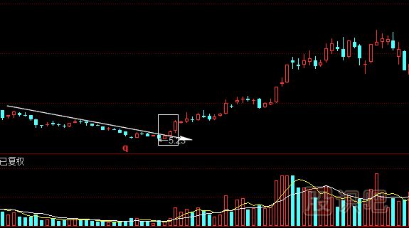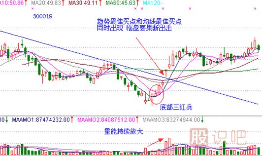 硅寶科技(300019)2010年2月,底部出現(xiàn)紅三兵后,量能持續(xù)放大,股價(jià)越過(guò)下降趨勢(shì)線壓制和均線密集封鎖,趨勢(shì)和均線最佳買點(diǎn)同時(shí)出現(xiàn),臨盤狙擊沒(méi)商量。從上圖看股價(jià)走勢(shì)非常凌厲,和上述案例一樣,股價(jià)最終完成了漂亮的底部V形反轉(zhuǎn)。