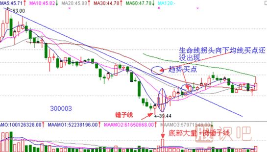 300003,樂普醫(yī)療,2010年1月28日出現(xiàn)了金針探底的特殊形式錘子線,隨后第三天2月1日就是我們傳說中的倒錘子線,而且伴有底部大量出現(xiàn),金針探底+倒錘子線組合是我研究中的必漲組合,由于底部大量的出現(xiàn),當(dāng)日實(shí)盤講解時(shí)就斷定此底部形態(tài)成立,后期越過阻擋線出現(xiàn)了趨勢(shì)買點(diǎn),但生命線拐頭現(xiàn)在仍然向下,決策線壓制股價(jià)明顯,穩(wěn)健投資者仍然需要耐心等待。