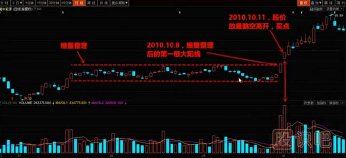 2.股價(jià)在縮量整理的過程中出現(xiàn)一根大陽(yáng)線。