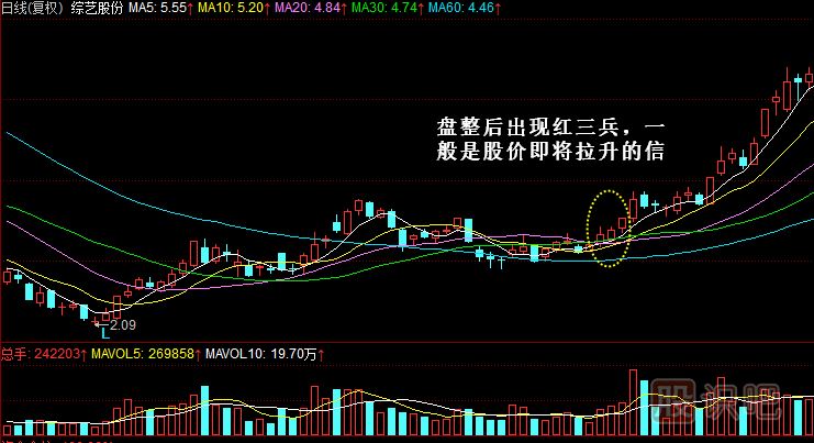 2.紅三兵的三根K線(xiàn)成交量逐步放大。