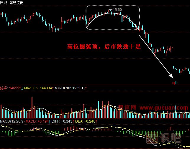 4.圓弧頂?shù)仔纬稍诠蓛r大幅上漲或長期低迷時信號更為準確。