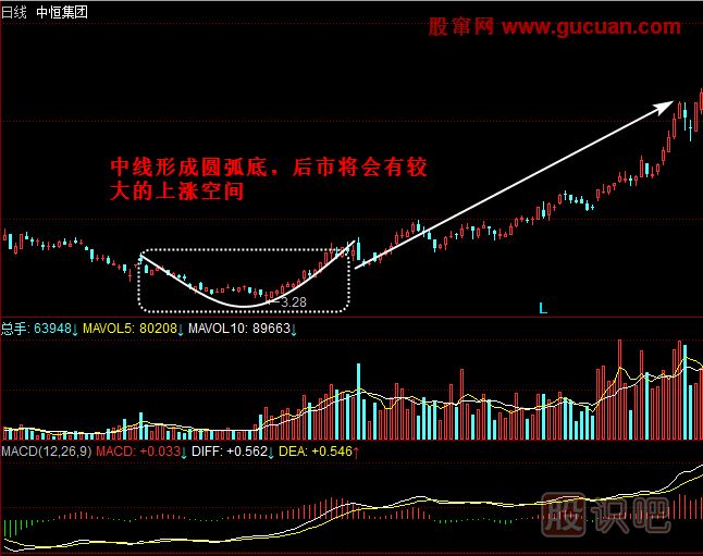 案例2:我們來看看圓弧底的走勢。如圖所示,這是中恒集團(600252)的周K線圖。中長周期的K線系統(tǒng)形成的頂?shù)赘鼫蚀_,更保險。2008年8月起,該股經(jīng)過前期的大幅下跌之后開始步入漫漫陰跌之路中,投資者信心全無。到當年10月底股價跌至最低3.28元后,開始緩慢上漲,用了幾乎相同的時間回到了陰跌開始時的價位。