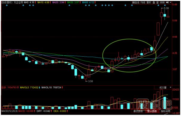 實(shí)例:方正證券股價(jià)在2012年12月探明了底部區(qū)域后反彈上行,在12月間形成一個(gè)穩(wěn)步上漲形形態(tài),之后股價(jià)開啟了一波上漲行情。