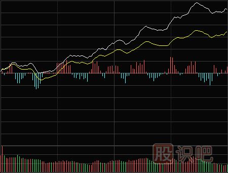 3)紅綠柱線:在紅白兩條曲線附近有紅綠柱狀線,是反映大盤即時(shí)所有股票的買盤與賣盤在數(shù)量上的比率。紅柱線的增長(zhǎng)減短表示上漲買盤力量的增減;綠柱線的增長(zhǎng)縮短表示下跌賣盤力度的強(qiáng)弱。