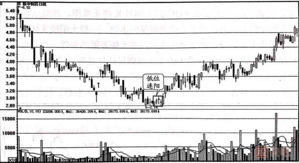 (2)低位連陽如果出現(xiàn)在股價上升趨勢初期,且每一根小陽線配合成交量溫和放大,同時股價排列逐漸向右上方傾斜,每一根小陽線帶有很小的下影線,收盤卻收在最高點或次高點,通常可視為主力的吸籌行為,后市股價極容易出現(xiàn)大幅走高行情。
