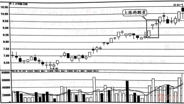 上漲兩顆星屬于常見(jiàn)的上漲中繼形態(tài),一般出現(xiàn)在大行情的初期。 大陽(yáng)線之后連續(xù)出現(xiàn)勢(shì)均力敵的信號(hào)意味著多空雙方的力量在新的條件下取得了平衡,空方?jīng)]有打壓股價(jià)的力量,多方的勝利被鞏固了,投資者對(duì)股價(jià)的上漲已經(jīng)取得了共識(shí),大陽(yáng)線取得的成果已經(jīng)得到市場(chǎng)的認(rèn)同,這往往是股價(jià)大幅度攀升的先兆。