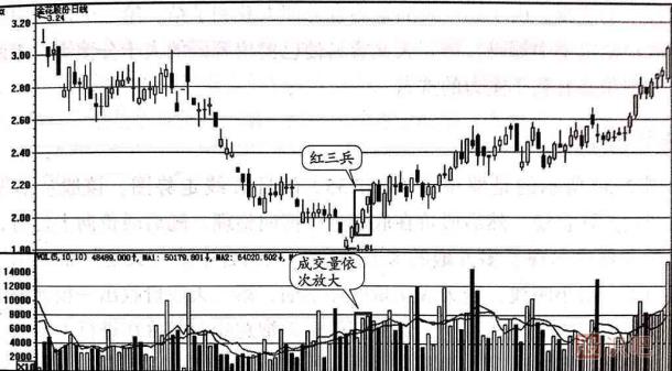 紅三兵中每一天的收盤(pán)價(jià)都在向上攀升并超過(guò)前一天的收盤(pán)價(jià),股價(jià)穩(wěn)健地逐步向上,是一種極為常見(jiàn)的而且準(zhǔn)確性很高的上升形態(tài)。 當(dāng)股價(jià)運(yùn)行經(jīng)過(guò)長(zhǎng)時(shí)間的下跌之后,一旦在底部企穩(wěn),隨后又出現(xiàn)紅三兵的K線組合,說(shuō)明此時(shí)市場(chǎng)上多方的能量正在不斷地聚集,后市股價(jià)極有可能出現(xiàn)大幅度上升,從此走出一波大行情來(lái)。