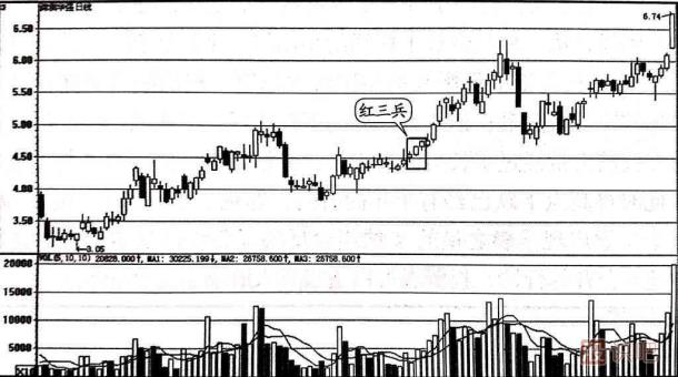 紅三兵由三根連續(xù)上漲的實(shí)體相當(dāng)?shù)?a href=http://m.srlcfj.com/GPRM/sy/1996.html target=_blank class=infotextkey>陽(yáng)線組成,這三根陽(yáng)線的收盤(pán)價(jià)一個(gè)比一個(gè)高,如圖1-17所示。接下來(lái)由股識(shí)吧來(lái)闡述多根K線紅三兵買(mǎi)入,還請(qǐng)大伙兒暢所欲言。