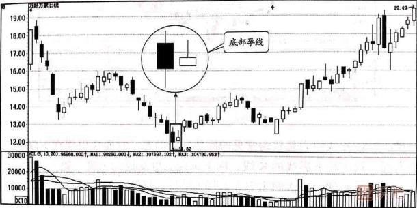 在股價運行處于下跌的走勢之中,一旦出現(xiàn)底部孕線的K線組合,就預示著此時空方的下跌動能已經(jīng)出現(xiàn)了衰竭,股價下跌的力度開始轉弱,或者是下跌的走勢出現(xiàn)了短暫的停頓,說明此時股價運行的方向即將發(fā)生改變。