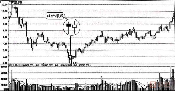 如圖1-10所示的是中糧生化(600930)的日k線走勢圖。該股從前期高點10.59元出現(xiàn)下跌,在圖中方框處形成了雙針探底的組合形態(tài)。 其中,第一根K線收出了下影線比上影線長幾倍的小陰線,第二天收出了一根小陽線,且下影線低點和前一根K線的下影線低點十分接近,還創(chuàng)出了此輪下跌的最低價6.01元,此時的跌幅已高達(dá)43%。雙針探底出現(xiàn)在跌幅較大的下跌趨勢中,無疑顯示了下檔支撐非常強(qiáng),多頭已經(jīng)開始出現(xiàn)反攻了。 對于投資者而言,只要這個低點不再被跌破,且股價出現(xiàn)放量突破這兩根上影線中的高點,就是買入股票的良好時機(jī)。
