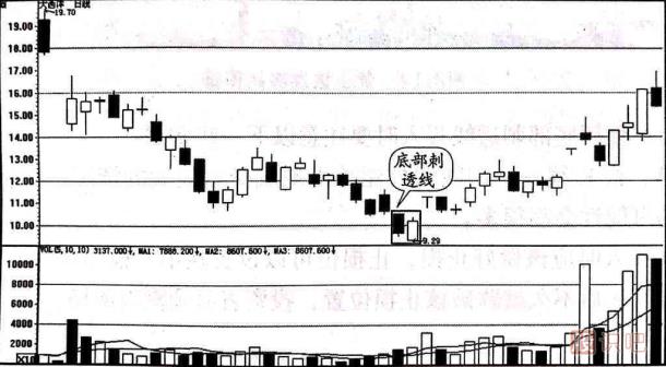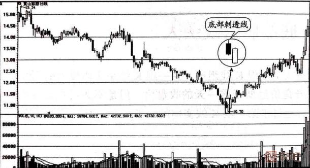 底部刺透線由兩根K線組成,第一根K線是實體較大的陰線,第二根K線跳空低開,開盤價遠低于前一天的收盤價,但是不久后在買盤的推動下價格回升并且收盤價超過了第一根K線實體的一半以上,形成了一根低開高走的陽線,如圖1-3所示。接下來由股識吧來解釋多根K線底部刺透線買入,皇天不負有心人,看完下文終于讓你知道。