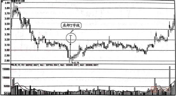 (2)投資者要特別觀察底部T字線出現(xiàn)后的股價(jià)走勢(shì),如果股價(jià)低點(diǎn)依次抬高才能確認(rèn)為股價(jià)探底成功,否則,就是無(wú)效的底部T字線走勢(shì)。