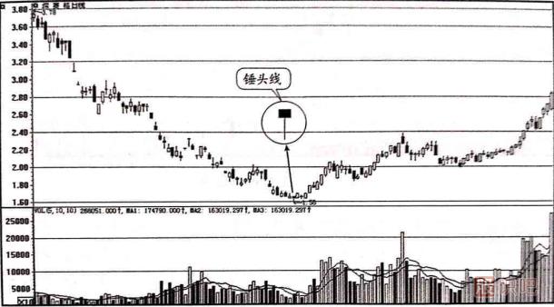 底部錘頭線通常出現(xiàn)在下跌的趨勢之中,股價經(jīng)過了長時間的下跌之后,賣方的力量基本上已經(jīng)釋放完畢,當股價達到階段性底部的時候,賣方通常因為慣性的作用再次出現(xiàn)急劇下跌.甚至創(chuàng)出近期以來的新低價位,表面上來看十分可怕,實際上這已經(jīng)是賣方的最后一跌了,賣方的力量已經(jīng)枯竭,股價即將止跌回升,已經(jīng)有資金開始低吸籌碼,表明多方發(fā)動進攻的時間已經(jīng)不遠了。如果出現(xiàn)錘頭線的時候,成交量也相應(yīng)放大,更應(yīng)該值得重視。