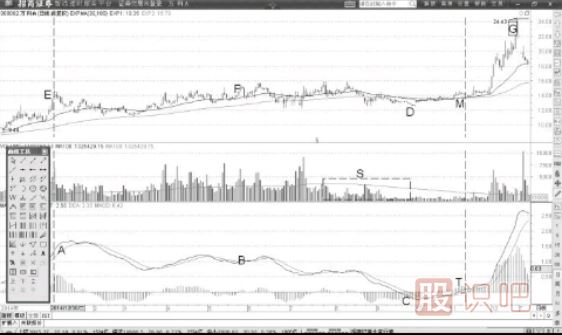 當(dāng)MACD指標(biāo)很快企穩(wěn)以后,我們能夠看到價(jià)格也同樣表現(xiàn)出強(qiáng)勢(shì)狀態(tài)。價(jià)格從D位置反彈以后,我們持股成本價(jià)在M位置的14元附近。股價(jià)飆升至G位置的24元,我們可以盈利達(dá)71%。