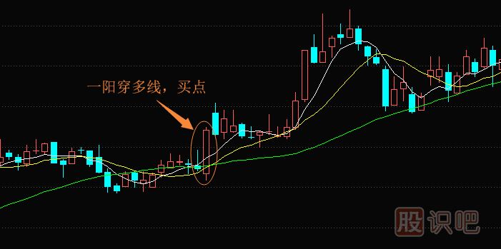 當(dāng)股價(jià)橫盤整理一段時(shí)間后,其多條均線往往會(huì)持續(xù)糾在一起。此時(shí)如果出現(xiàn)一根長(zhǎng)陽(yáng)線,一舉向上穿越多條均線,就形成了一陽(yáng)穿多線的形態(tài)。