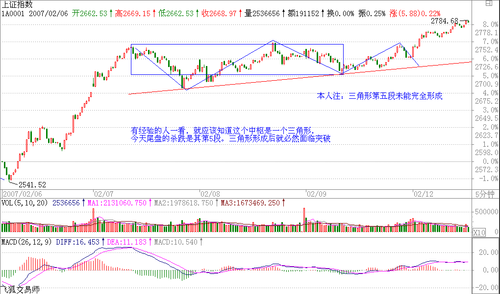 今天大盤沒什么可說的,就是圍繞一直強調(diào)的2720點震蕩。有經(jīng)驗的人一看,就應(yīng)該知道這個中樞是一個三角形,今天尾盤的殺跌是其第5段。三角形形成后就必然面臨突破,而且這時間就在下周初,方向也簡單,就是看2720站穩(wěn)還是站不穩(wěn),站不穩(wěn)就2次探底,否則就再來1波。至于是否站穩(wěn),看看短線指標(biāo)就很容易判斷。